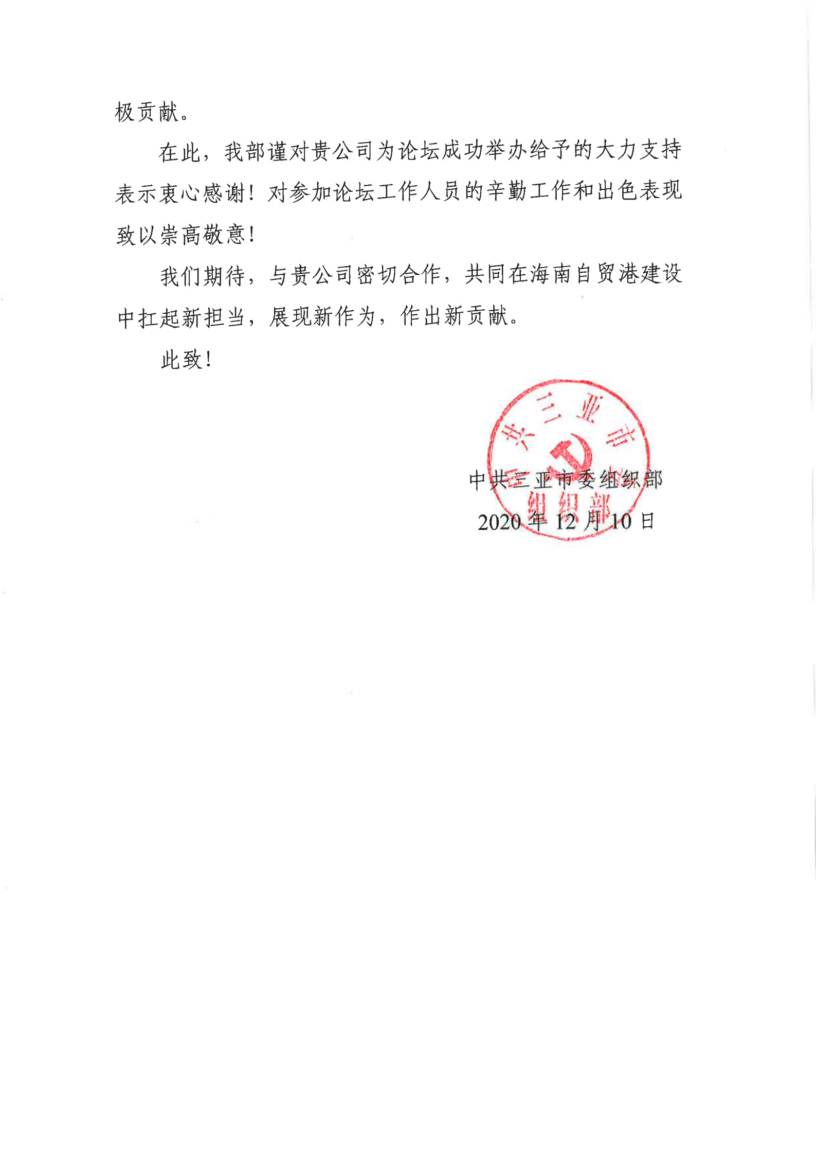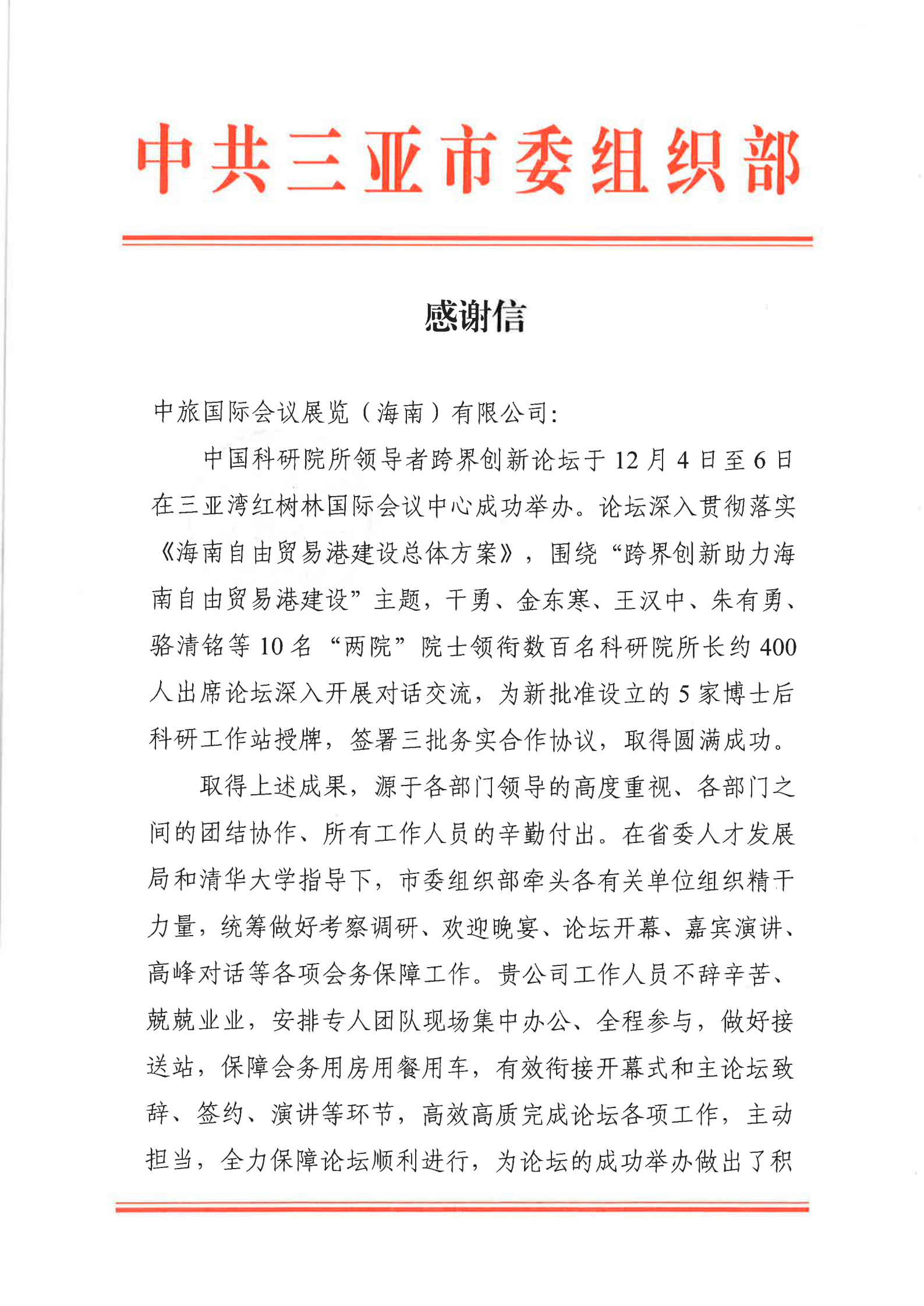 10名“兩院”院士領銜數百名科研院所長出席論壇交流科技跨界創新,助力海南自由貿易港建設。中旅會展發揮專業優勢全案承接本屆論壇,包括考察調研、論壇開幕、嘉賓演講、高峰對話、歡迎晩宴等各項會務保障工作,優質的服務和專業的大項目管理經驗榮獲了三亞市委組織部高度認可,三亞市委組織部向我司頒發了感謝信,予以表彰我司在活動中做出的突出貢獻,以資鼓勵。