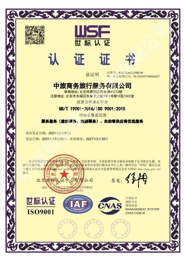 本次中旅會展認證內容涵蓋:展會管理、會議管理、旅游及機場休息室服務;中旅商旅認證內容涵蓋差旅票務,旅游票務,酒店自助餐星級評定等。我司高度重視認證工作,并成立專項小組悉心建立質量手冊、控制文件和管理記錄,統籌推進項目認證環節落地,最終通過評審順利獲得ISO9001質量管理體系認證證書。