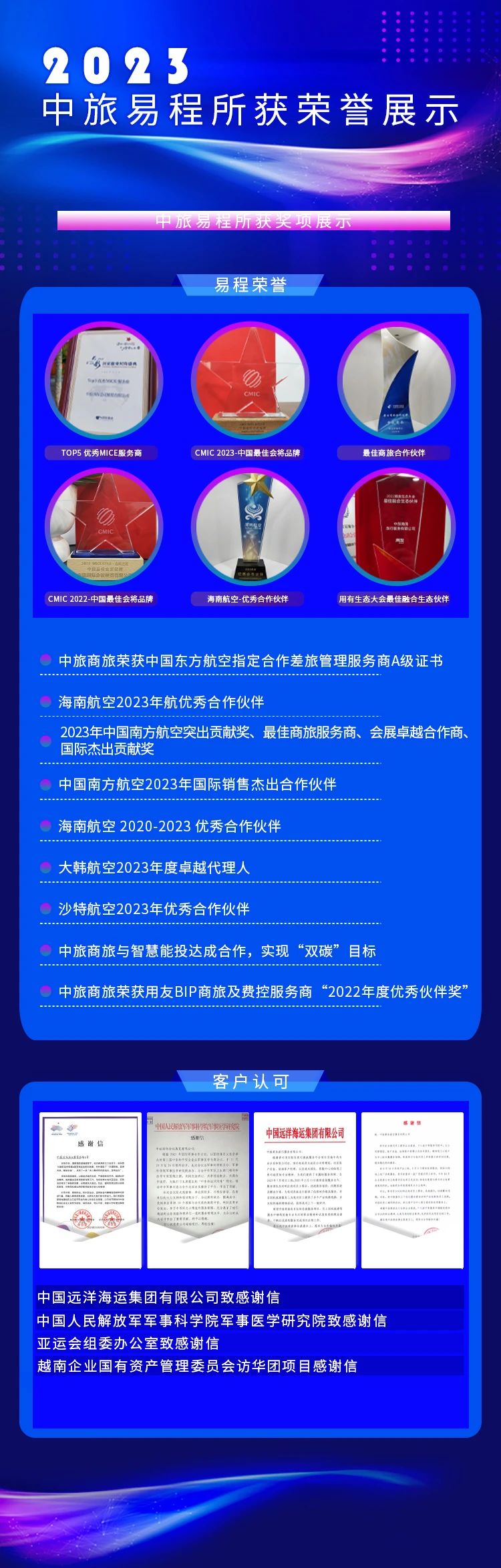 2023年,中旅旅行所屬中旅易程緊緊圍繞“集團(tuán)管理服務(wù)提升年”有關(guān)精神,持續(xù)提升自身服務(wù)效能和夯實(shí)專業(yè)水平,贏得諸多來自客戶、供應(yīng)商伙伴的認(rèn)可與贊許,榮獲業(yè)界多類獎(jiǎng)項(xiàng)。每一項(xiàng)榮譽(yù)都承載了中旅易程對每一個(gè)項(xiàng)目的精心打磨,蘊(yùn)含著每一次服務(wù)中的自我創(chuàng)新與突破。